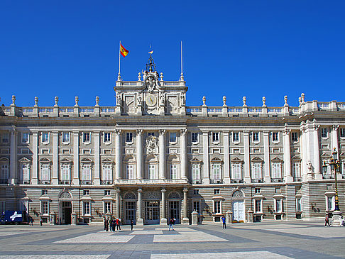 Der Eingang zum Palacio Real befindet sich gegenüber der Catedral de Santa Mariá de la Almudena - eine Kathedrale, die nach sagenhafter einhundertjähriger Bauzeit im Jahre 1993 vom Papst geweiht wurde. Bereits durch die Eisenstäbe des Zauns hat man einen fantastischen Blick auf die Fassade des Palacio Real. Aus dieser Perspektive lohnt sich auf jeden Fall ein Foto.