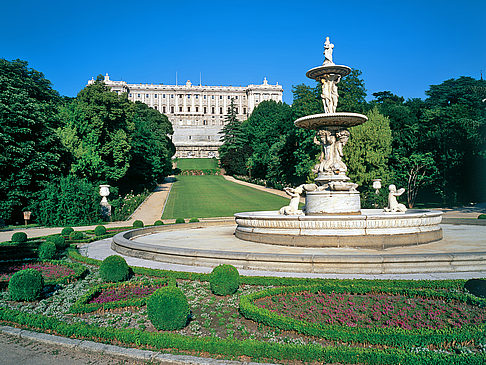Vom Plaza de Oriente 2 , mit seiner fröhlichen Atmosphäre und dem bunt gemischten Publikum, führt die Calle de Bailén an der Ostseite des Palacio Real entlang bis zum südlichen Haupteingang. Die 500 Meter lange Seitenfassade des im Jahre 1764 fertiggestellten Bauwerks lässt den Besucher bereits die gigantischen Ausmaße des Königspalastes erahnen.